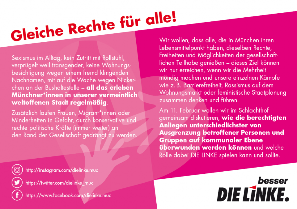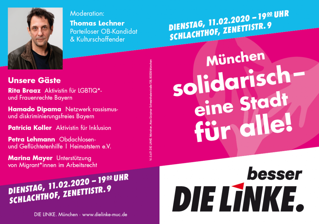 München – solidarisch – eine Stadt für alle! Kalender Wann: 11. Februar 2020 um 19:00 Europe/Berlin Zeitzone 2020-02-11T19:00:00+01:00 2020-02-11T19:15:00+01:00 Wo: Schlachthof Zenettistr. 9 Kontakt: DIE LINKE. München E-Mail Website der Veranstaltung Veranstaltungen